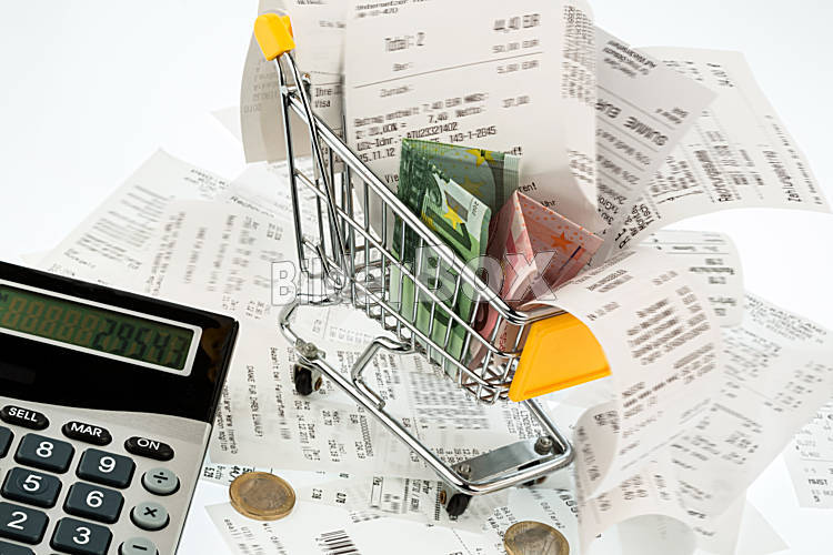 Einkaufswagen, Kassenbons und Geld