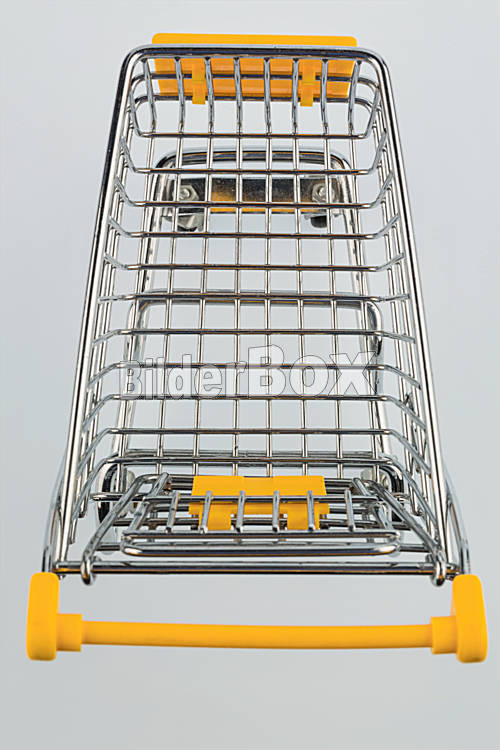 Beschreibung Ein leerer Einkaufswagen auf weißem Hintergrund. Symbolfoto für Einkaufen