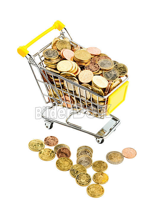 Beschreibung Ein Einkaufswagen ist mit Euromünzen gut gefüllt, Symbolfoto für Kaufkraft und Konsum