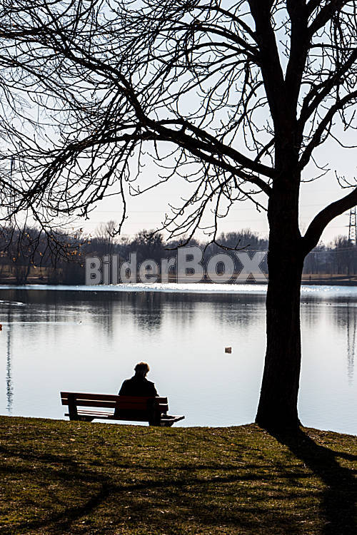 Beschreibung Ein EInsamer Mann sitzt bei einem See auf einer Parkbank