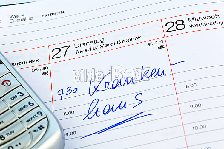 Beschreibung Ein Termin ist in einem Kalender eingetragen: Krankenhaus