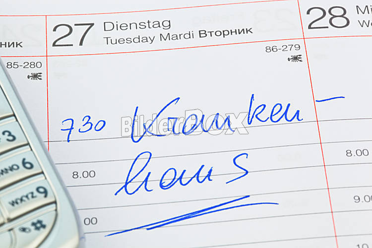 Beschreibung Ein Termin ist in einem Kalender eingetragen: Krankenhaus
