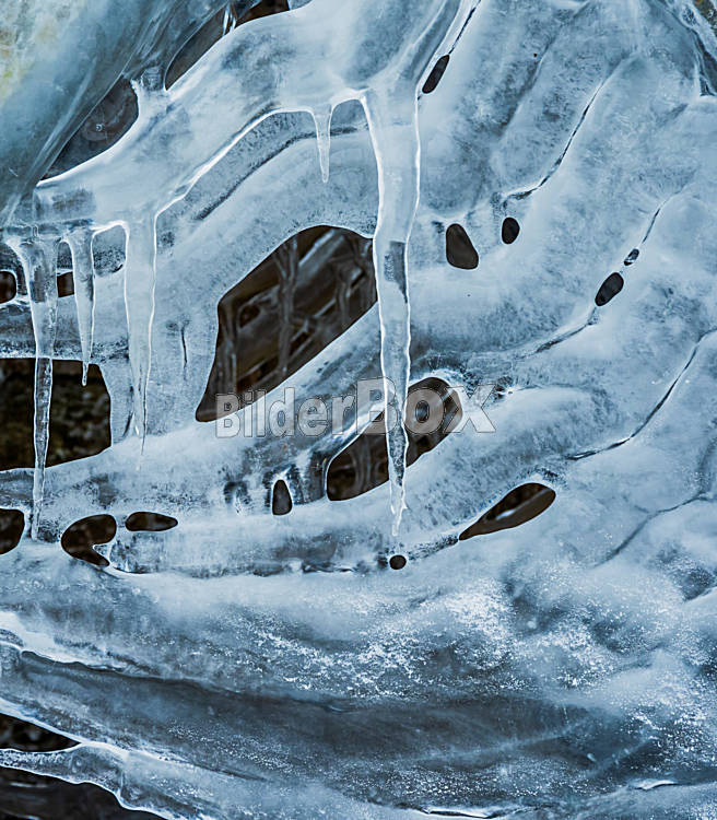 Beschreibung Eiszapfen durch gefrorenes Wasser auf einem Mühlrad in Österreich, OÖ, Nähe Freistadt