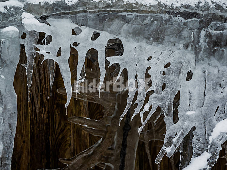 Beschreibung Eiszapfen durch gefrorenes Wasser auf einem Mühlrad in Österreich, OÖ, Nähe Freistadt