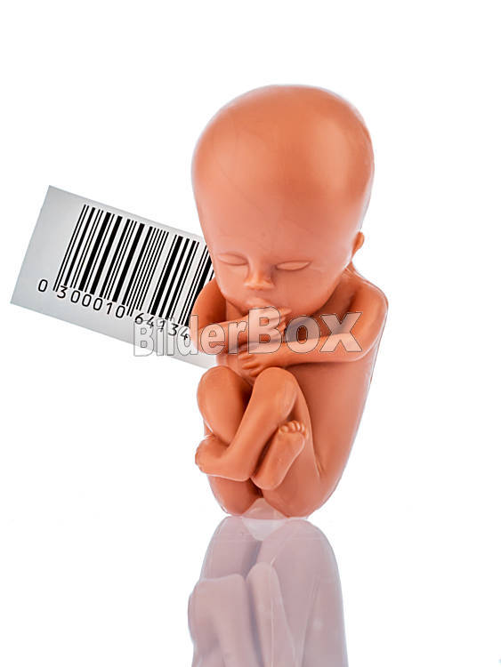 Beschreibung Ein 12-Wochen alter Emybro aus Plastik mit Strichcode. Modell für Leihmutter, Gentechnik und künstliche Befruchtung