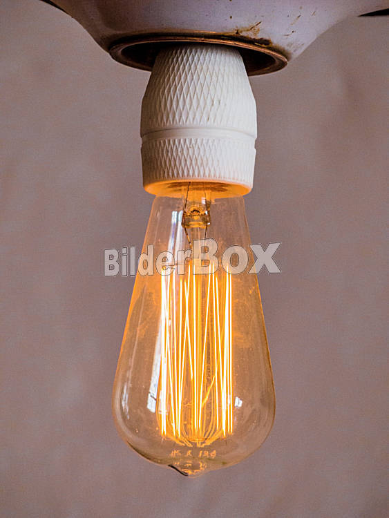 Beschreibung Energiesparlampe, Symbolfoto für Energiesparen, Ökologie, Umweltschutz. Glühfaden einer Glühbrine