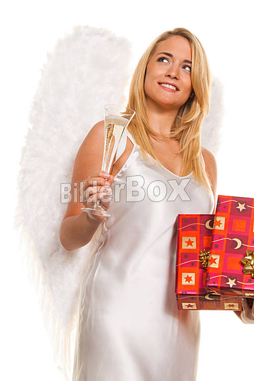 Beschreibung Blonder Engel zu Weihnachten mit Paketen und Geschenken.