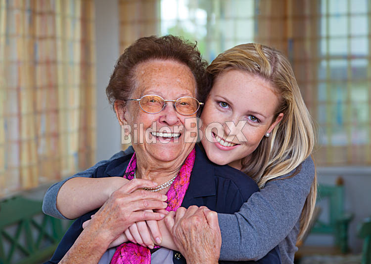 Beschreibung Ein Enkel besucht seine Großmutter. Spaß und Freude bei der Umarmung.