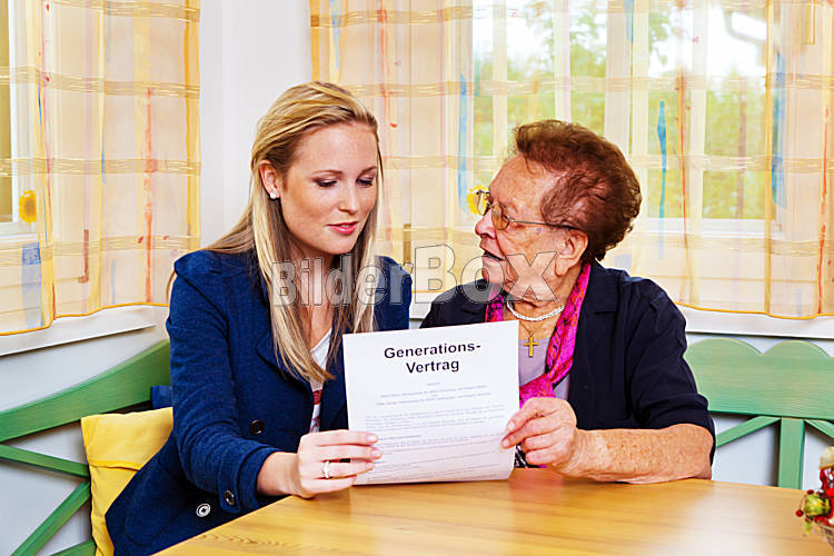 Beschreibung Ein Enkel besucht seine Großmutter und liest einen Generationsvertrag.