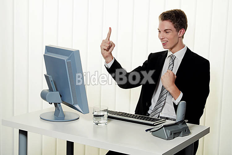 Beschreibung Ein Erfolgreicher Jungunternehmer am Schreibtisch im Büro