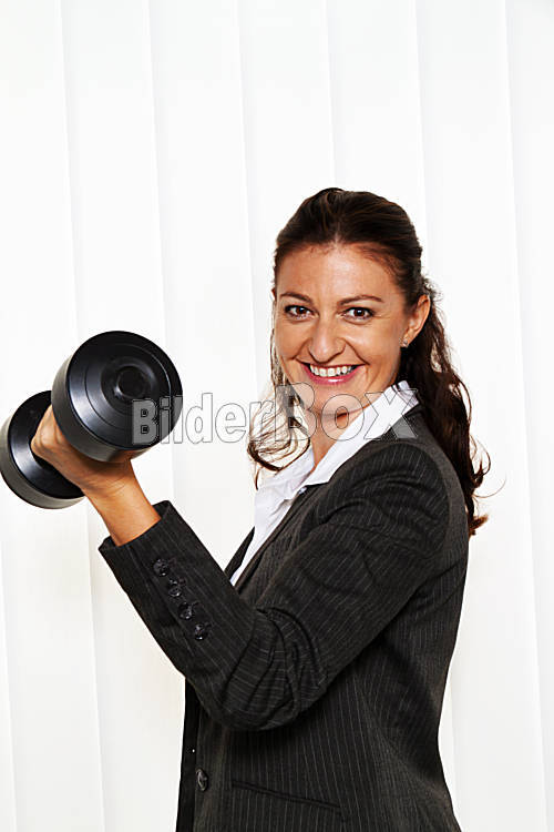 Beschreibung Junge, erfolgreiche Unternehmerin im Büro. Hebt ein Gewicht.