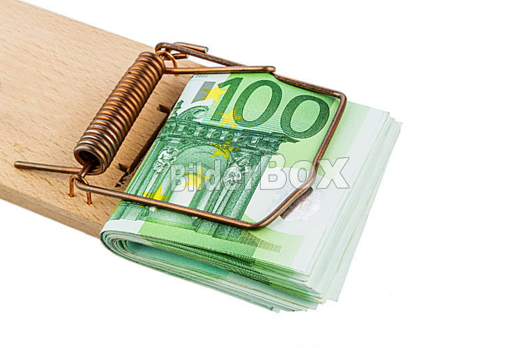 Beschreibung Viele Euro-Geldscheine in Mausefalle. Symbolfoto für Schulden und Schuldenfalle bei Krediten.