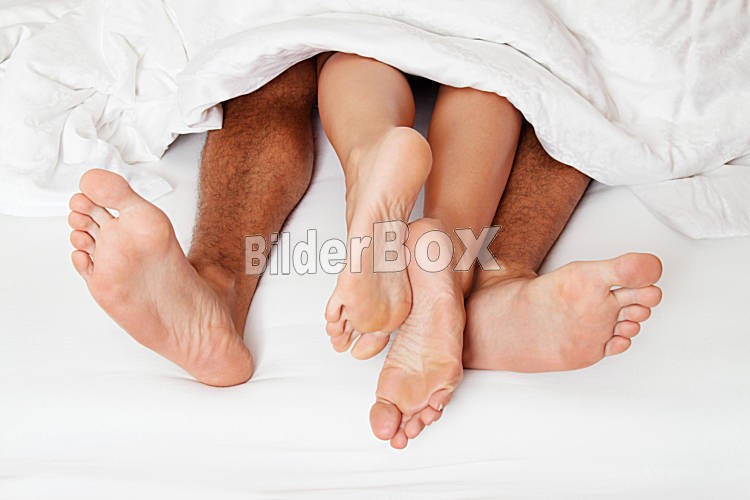 Beschreibung Dier Füße eines Paares im Bett. Liebe, Erotik und Partner.