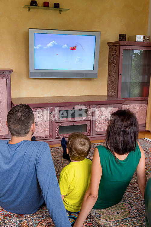 Beschreibung Familie sitzt vor einem Fernsehgerät und sehen sich eine Kindersendung an.