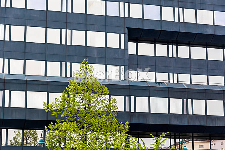 Beschreibung Die Fassade von einem Bürohaus in einer Stadt. Mit grünem Baum im Vordergrund