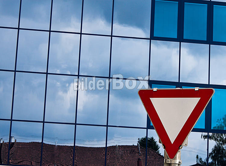 Beschreibung Die Glasfassade mit Fensterfront eines Bürohauses.