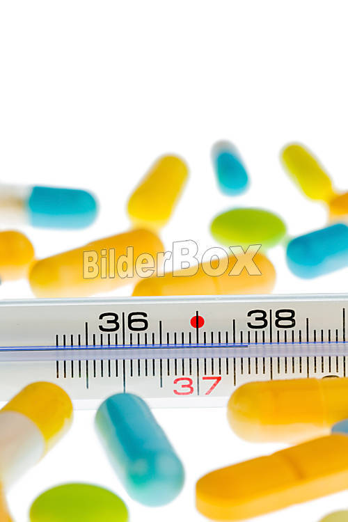 Beschreibung Ein Fieberthermometer und Tabletten. Symbolfoto für Grippe und Erkältungen