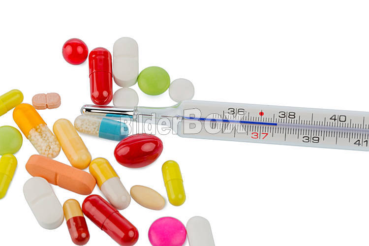 Fieberthermometer und Tabletten