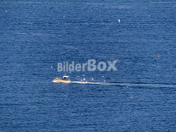Beschreibung Fischerboot unterwegs auf dem Meer, Symbolfoto für Fischerei, Arbeitswelt, Schifffahrt