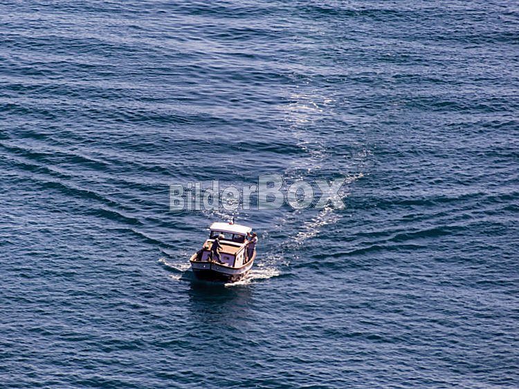 Beschreibung Fischerboot unterwegs auf dem Meer, Symbolfoto für Fischerei, Arbeitswelt, Schifffahrt