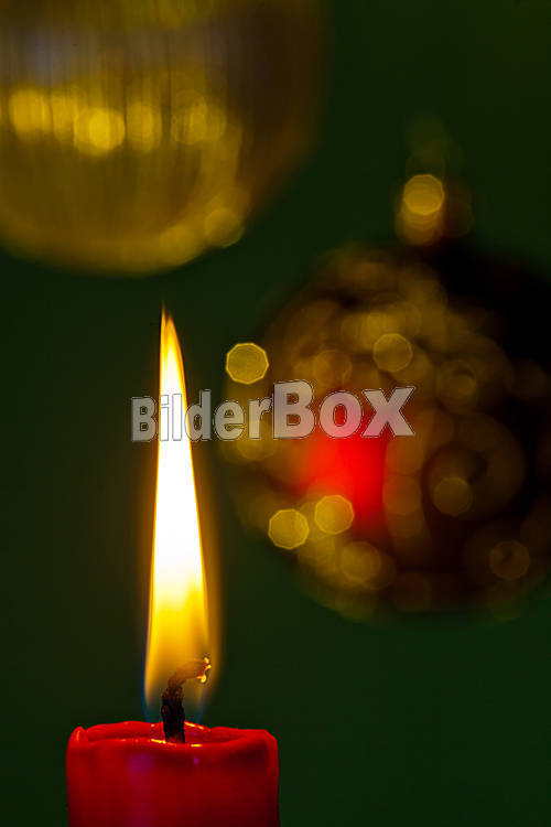 Beschreibung Die Flamme einer Kerze bringt Licht in die Dunkelheit. Mit Weihnachtskugeln