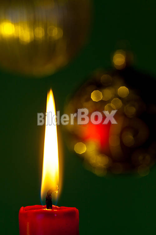 Beschreibung Die Flamme einer Kerze bringt Licht in die Dunkelheit. Mit Weihnachtskugeln