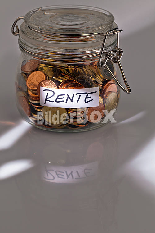Beschreibung Ein Glas mit Münzen für die spätere Vorsorge im Alter. Aufbesserung der Rente