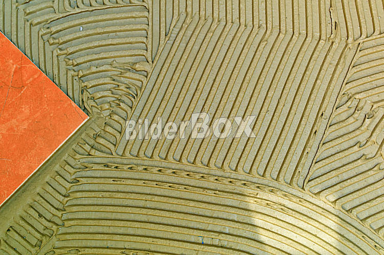 Beschreibung Fliesenkleber zum Anbringen von Wandfliesen wird mit einer Spachtel aufgetragen.