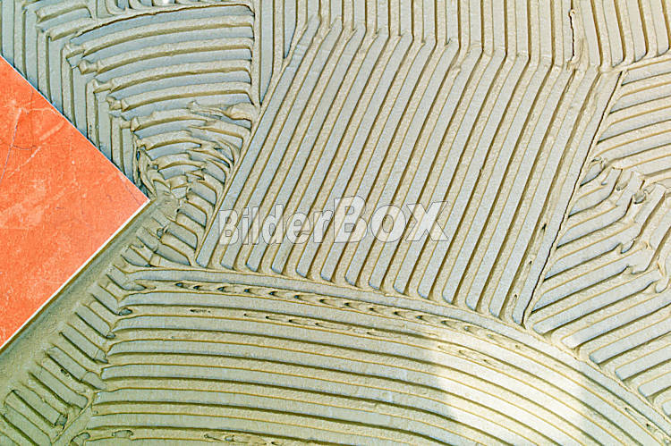 Beschreibung Fliesenkleber zum Anbringen von Wandfliesen wird mit einer Spachtel aufgetragen.