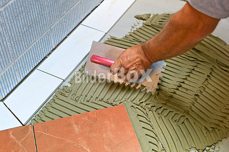 Beschreibung Ein Fliesenleger bei der Arbeit. Ankleben von Bodenfliesen mit Fliesenkleber und Spachtel.