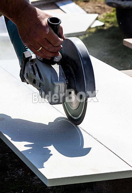 Beschreibung Ein Fliesenleger bei der Arbeit. Zerschneidet Platten mit einer Trennscheibe