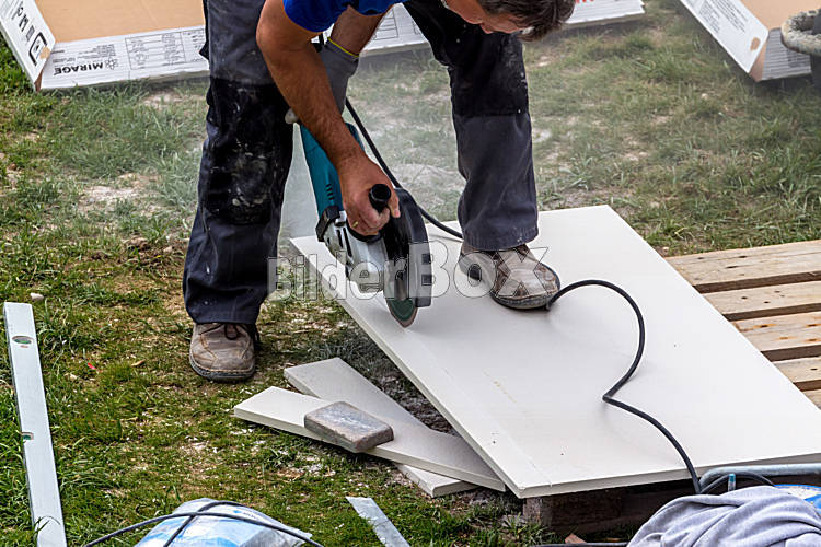 Beschreibung Ein Fliesenleger bei der Arbeit. Zerschneidet Platten mit einer Trennscheibe