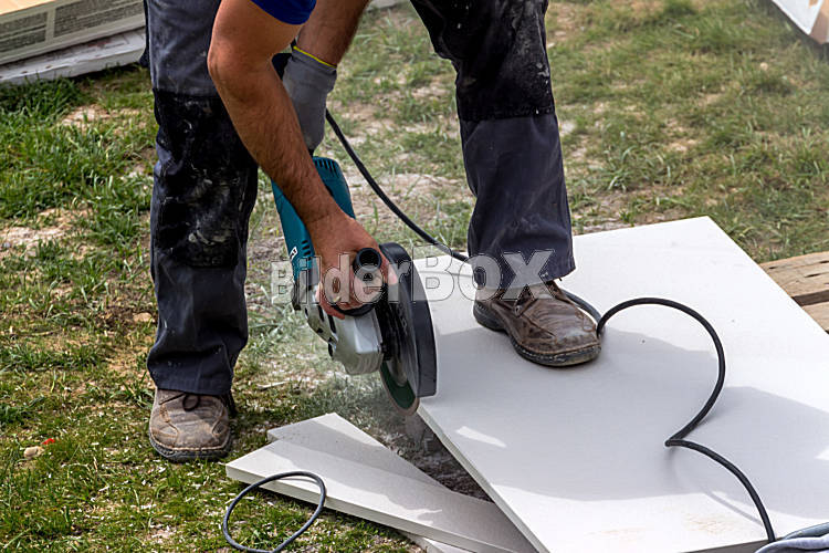 Beschreibung Ein Fliesenleger bei der Arbeit. Zerschneidet Platten mit einer Trennscheibe