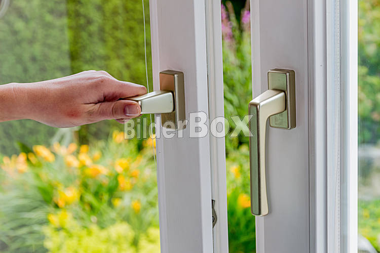 Beschreibung Eine Frau öffnet ein Fenster zum Lüften der Wohnung. Frische Luft im Zimmer