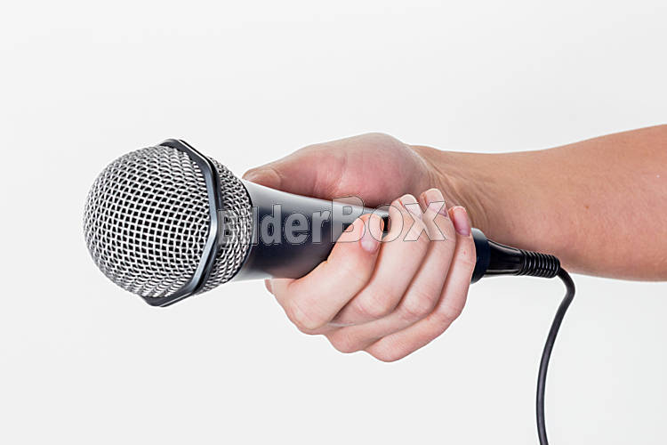 Beschreibung Eine Frau hält ein Mikrofon in der Hand. Interview und Meinungsumfrage