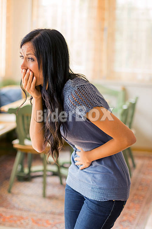 Beschreibung Eine junge Frau hat Schmerzen im Bauch