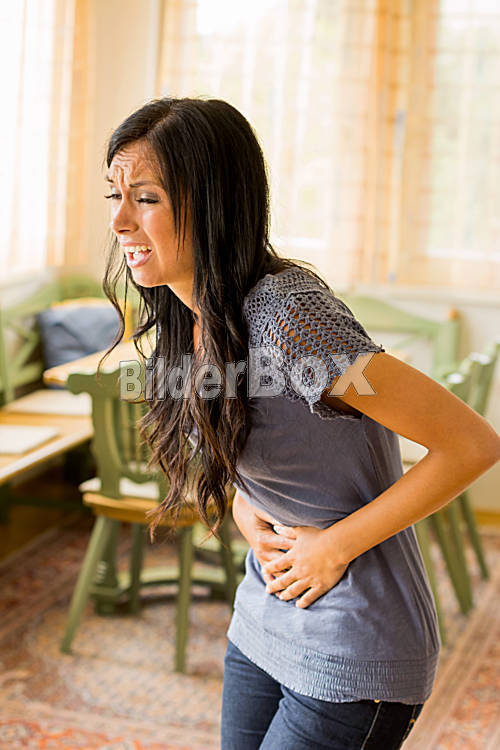 Beschreibung Eine junge Frau hat Schmerzen im Bauch