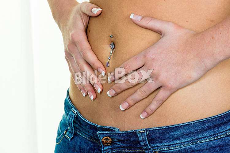 Beschreibung Eine Frau hat Bauchschmerzen oder Magenschmerzen. Hände in Herzform um Nabel Piercing.