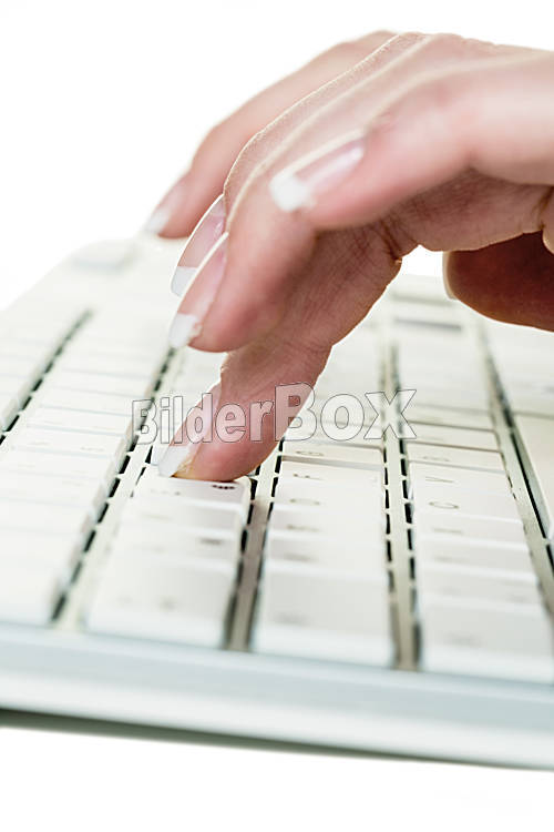 Beschreibung Frau im Büro mit Computer. Schreibt auf einer Tastatur