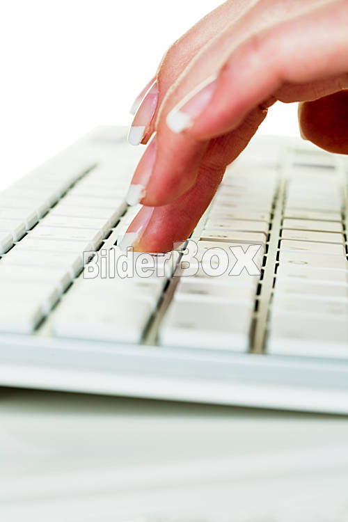 Beschreibung Eine Frau arbeitet in einem Büro auf der Tastatur eines Computers