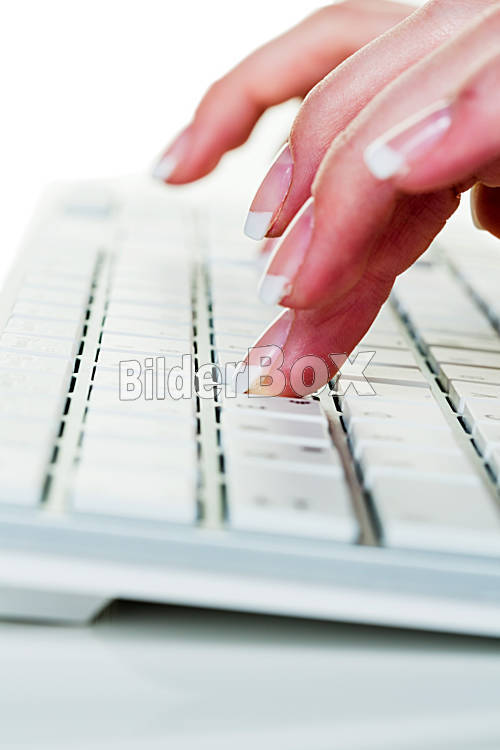 Beschreibung Eine Frau arbeitet in einem Büro auf der Tastatur eines Computers