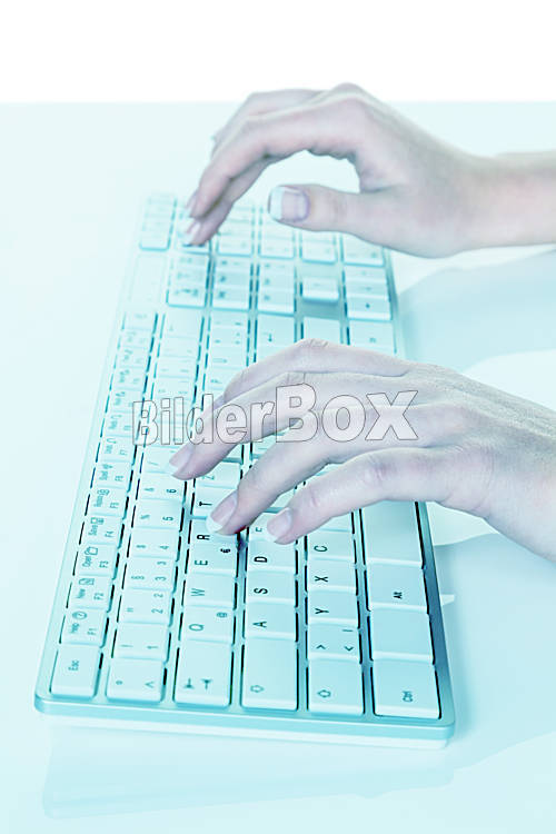 Beschreibung Eine Frau arbeitet in einem Büro auf der Tastatur eines Computers