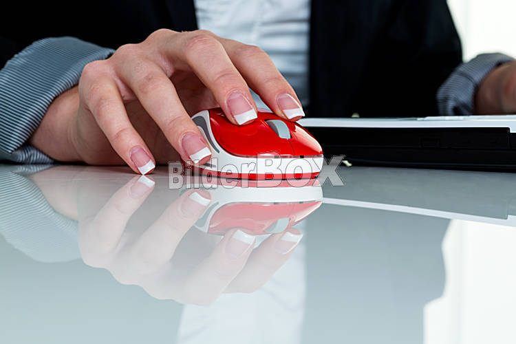 Beschreibung Eine Frau arbeitet in einem Büro und hät die Maus eines Computers in der Hand.