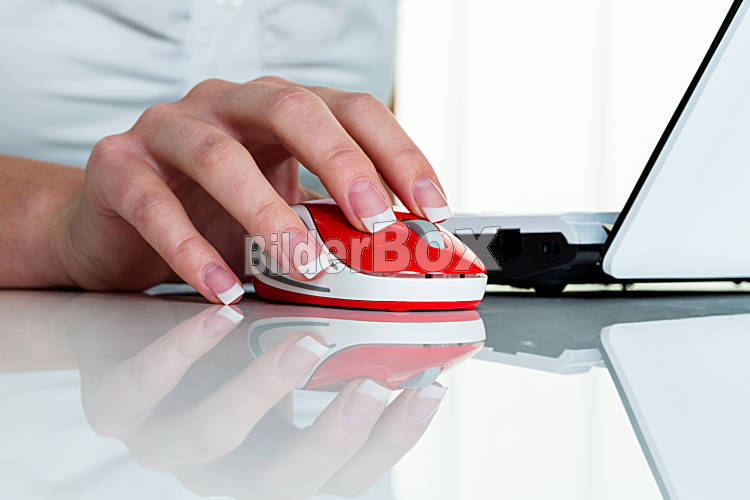 Beschreibung Eine Frau arbeitet in einem Büro und hät die Maus eines Computers in der Hand.