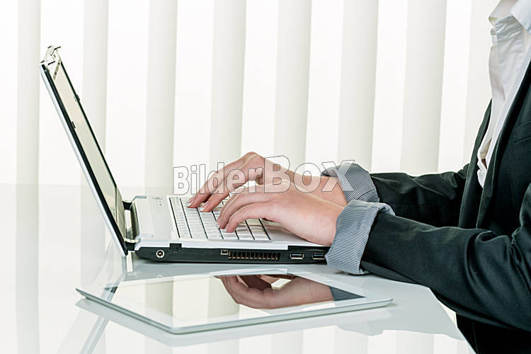 Beschreibung Frau im Büro mit Laptop Computer. Schreibt auf der Tastatur