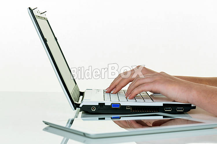 Beschreibung Eine Frau arbeitet in einem Büro mit einem Laptop Computer