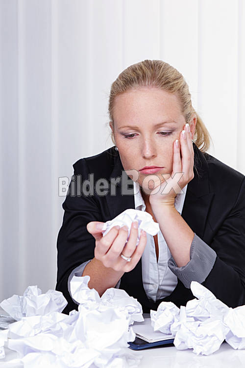 Beschreibung Eine Frau im Büro mit Papierknäuel. Ärger, Stress und Frust am Arbeitsplatz