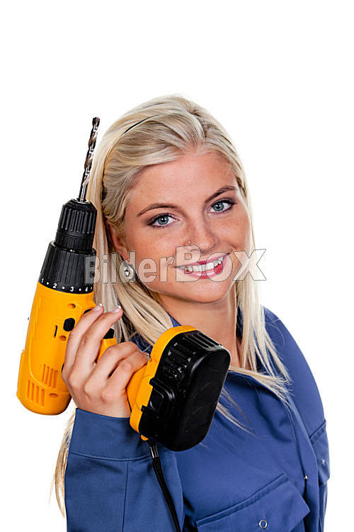 Frau in blauer Arbeits Kleidung mit Bohrmaschine