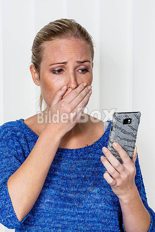 Beschreibung Eine Frau bekommt schlechte Nachrichten per SMS und ist geschockt.