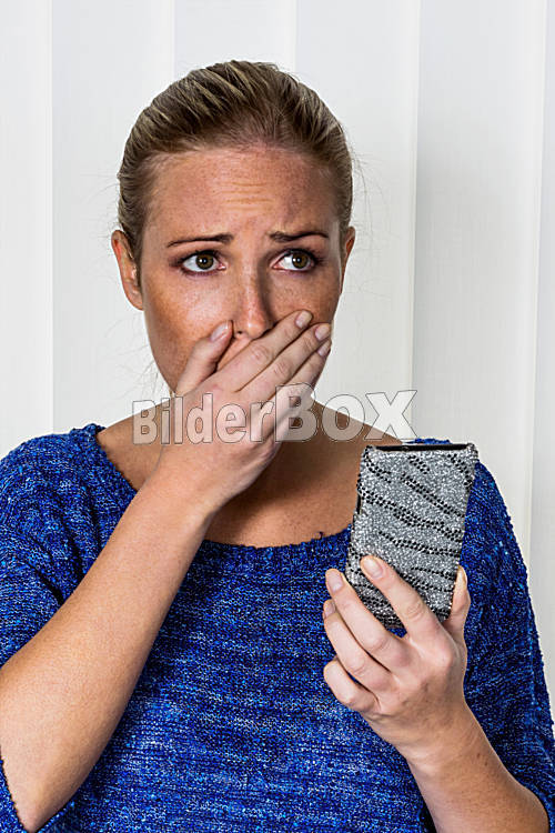 Beschreibung Eine Frau bekommt schlechte Nachrichten per SMS und ist geschockt.